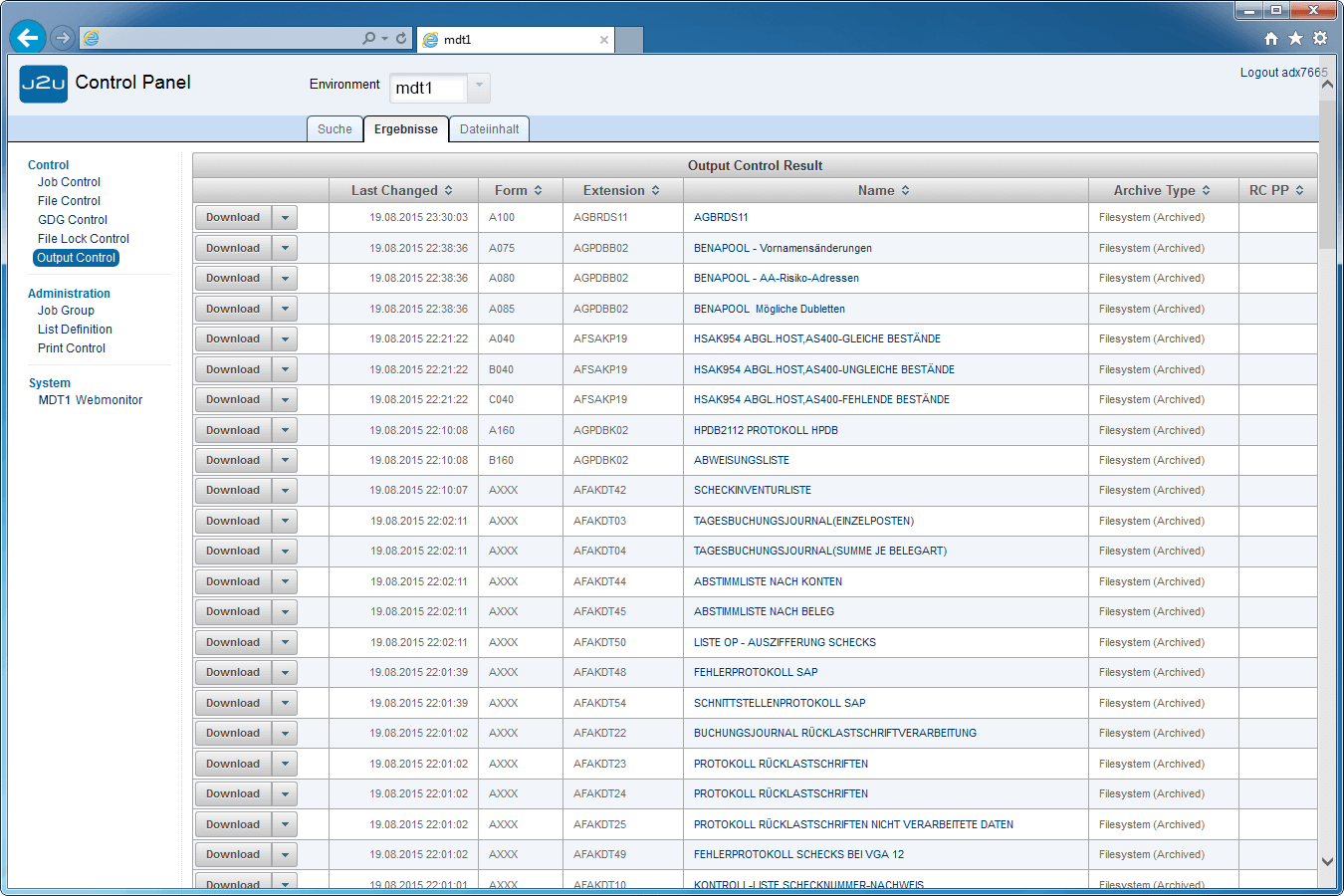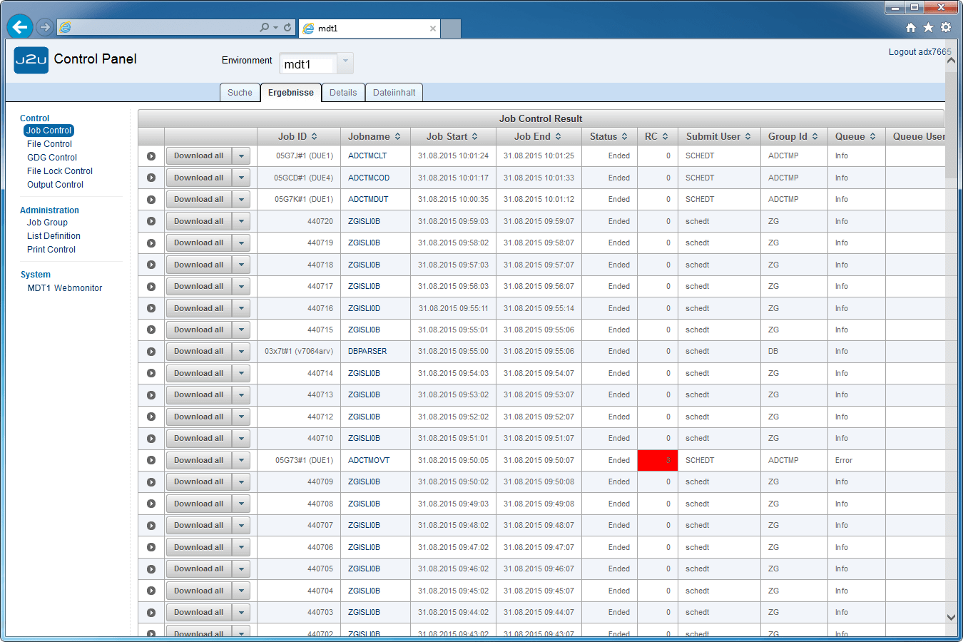 Die Job Control Ergebnisliste zeigt die Treffer zu den selektierten Suchkriterien an. Die Liste enthält zu jedem Job die relevanten Informationen wie Jobnummer, Start- und Ende-Timestamp, den aktuellen Status, Returncode und Jobgruppen-Zugehörigkeit.