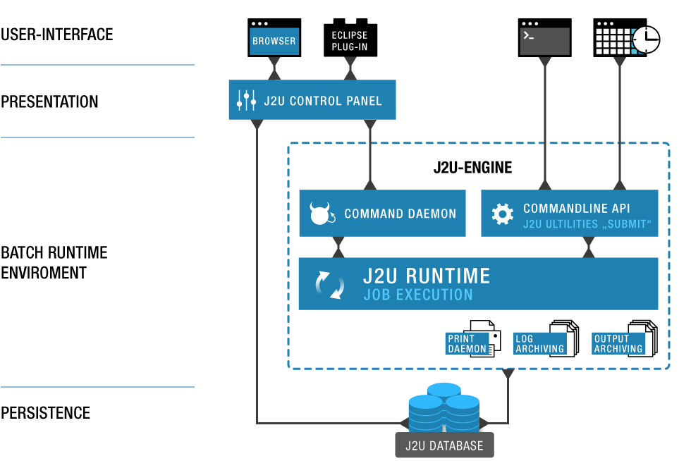 Mit der zentralen Ablage von Jobs, Log- und Outputdateien stellt J2U in der dezentralen Welt die Integrationsplattform für Zugriffe und für die Anbindung weiterverarbeitender Systeme dar.