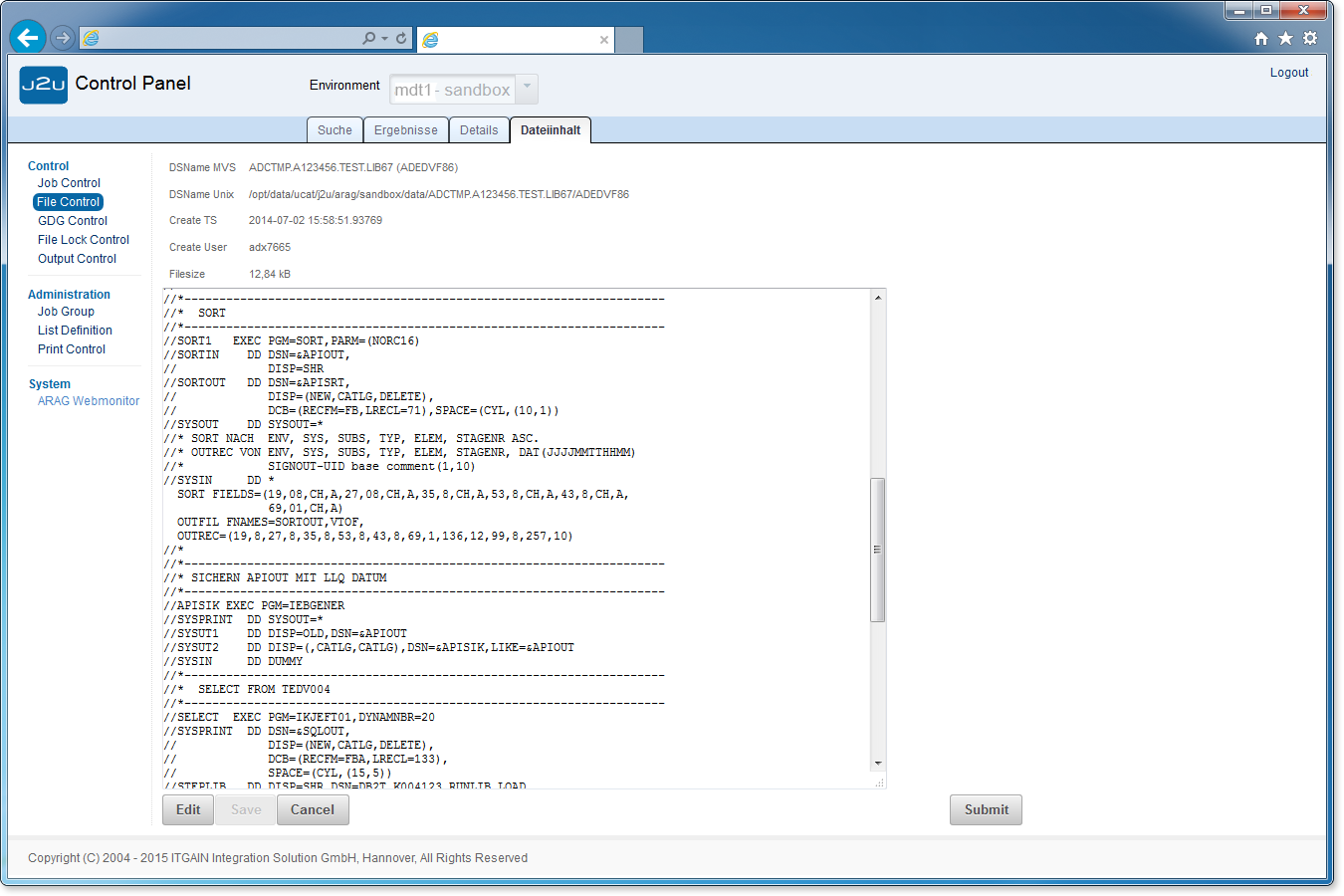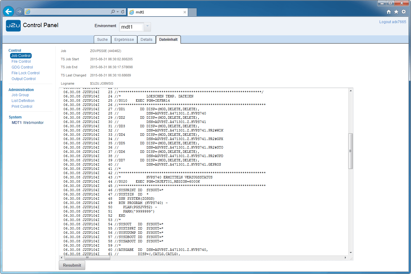 Unter Dateiinhalt wird die selektierte Log-Datei angezeigt. Die Log-Dateien besitzen den von JESx unter z/OS gewohnten Aufbau und werden im Falle eines laufenden Jobs kontinuierlich fortgeschrieben.