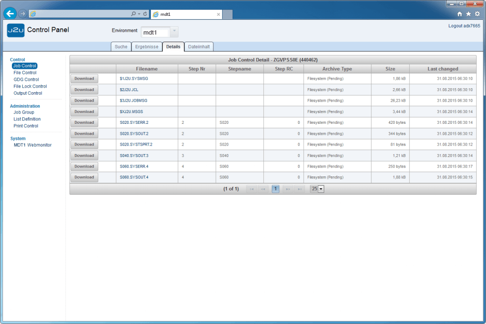 Die einzelnen Log-Dateien des Jobs werden unter Job Control Details aufgelistet. Neben dem Bezug zu dem Job-Step mit dem zugehörigen Step-Returncode wird der aktuelle Archivierungsstatus angezeigt.