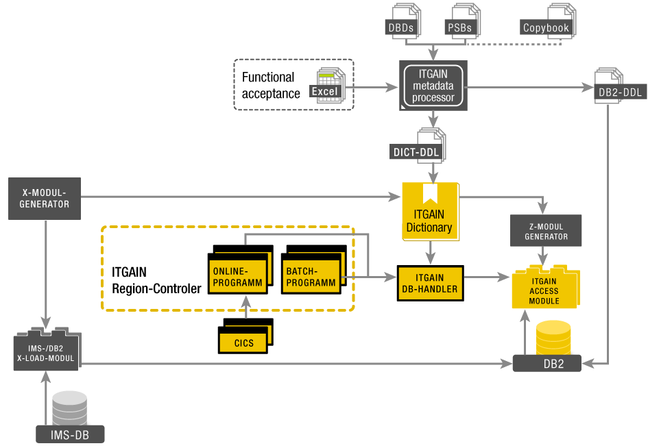 Um Daten von IMS nach DB2 oder Oracle zu übernehmen, müssen diese unter Wahrung des hierachischen Modells aus IMS gelesen und nach DB2 oder Oracle übertragen werden. Dies geschieht mit Hilfe von speziellen Unload- / Load-Programmen, die auf Basis der gewonnenen Datendefinitionen generiert werden und die Daten automatisch auf das Zielsystem übertragen.