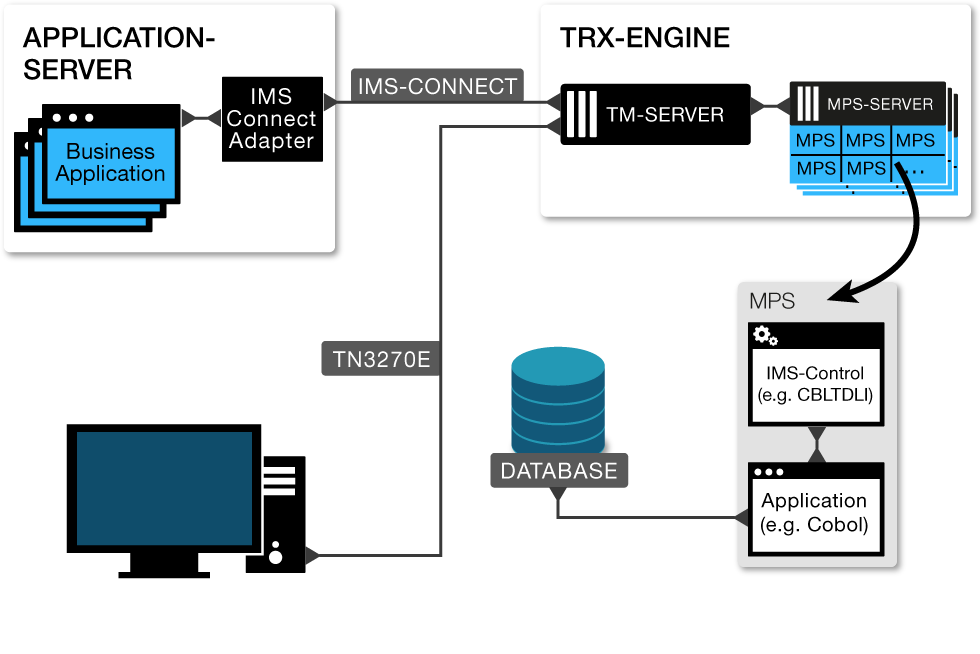 Die TRX-Engine bietet Unabhängigkeit bzgl. der Client-Anwendungen, denn sie unterstützt sowohl 3270-Terminals als auch den universellen Aufruf über eine Connect-Schnittstelle.